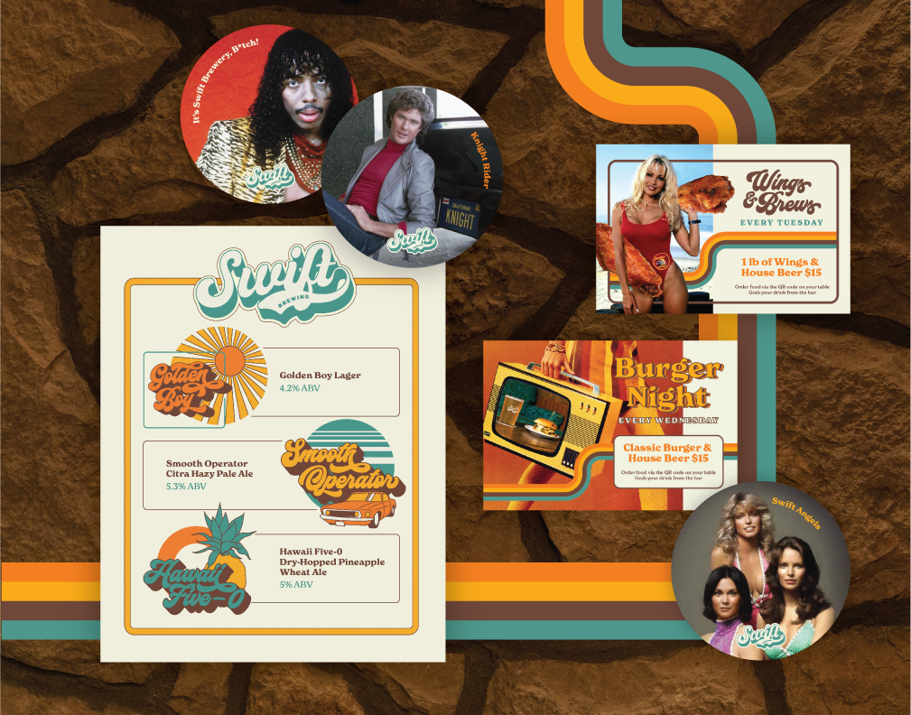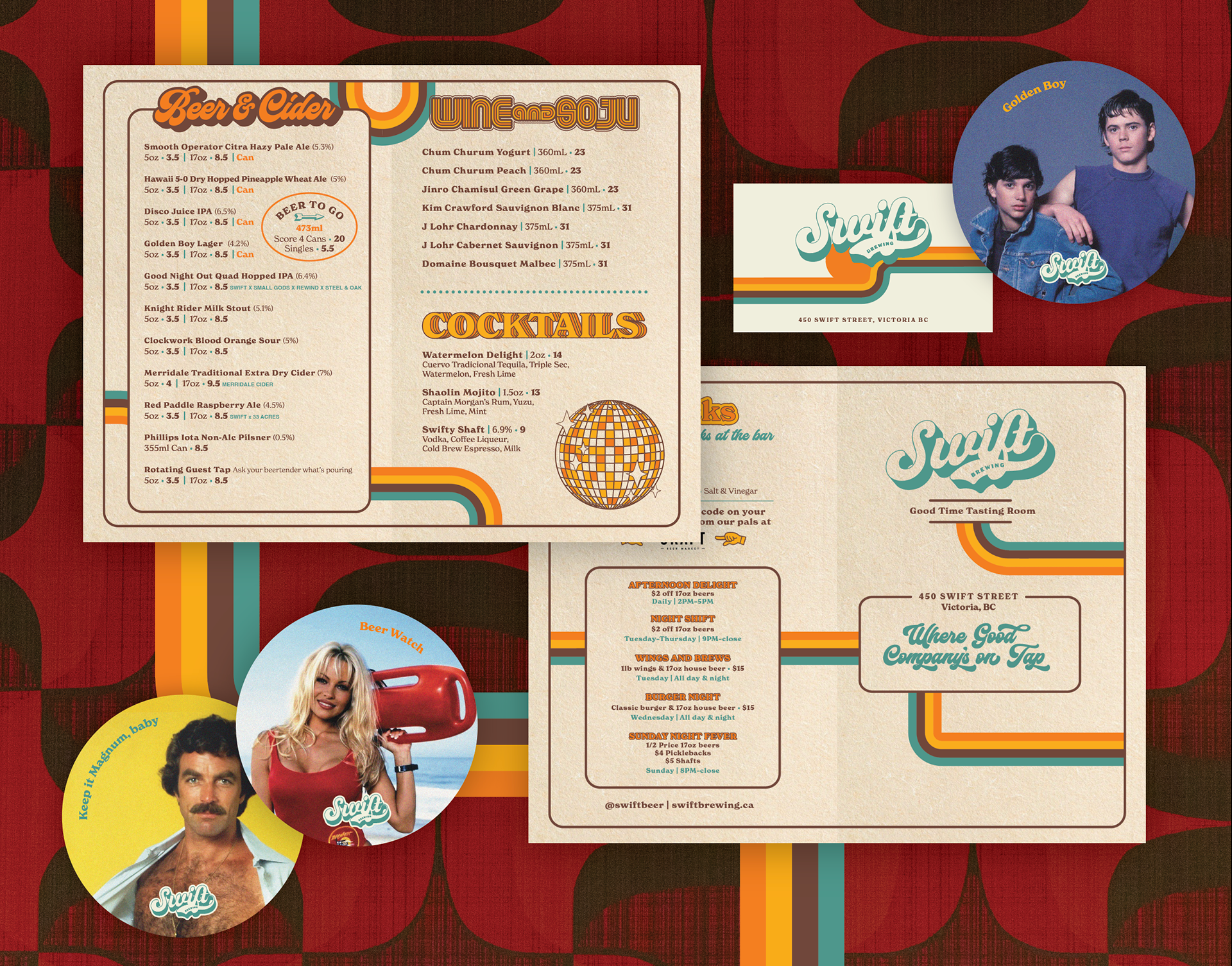 Swift Brewing is a craft brewery located in Victoria, BC. I was tasked with creating a brand based on the brief of 70's nostalgia. Following the brand I created, I have produced a variety of collateral for the brewery as well as the packaging design of their beer cans.